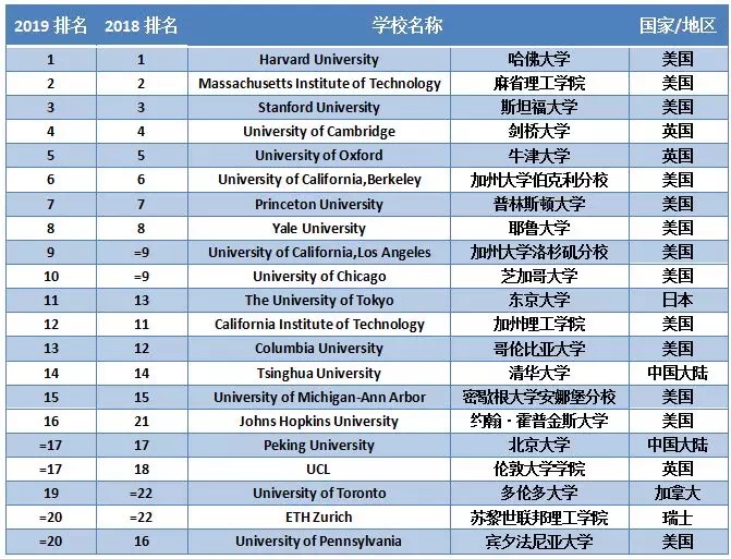 前十強(qiáng)的名單幾乎沒有任何變動,依舊是英美高校的主場。主要的調(diào)整是11-20名之間,約翰霍普金斯大學(xué)與賓夕法尼亞大學(xué)的位置“互換”。